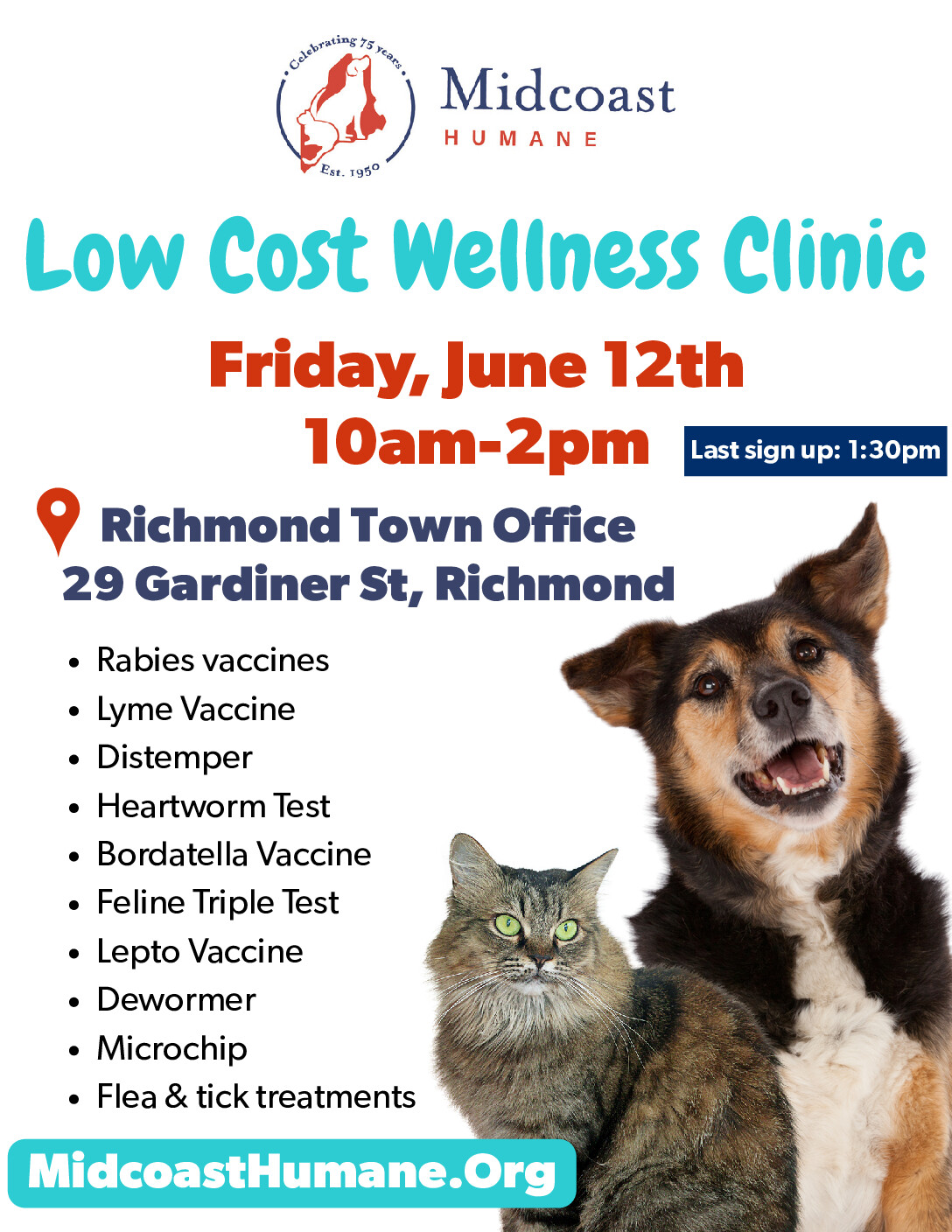 Low Cost Wellness Clinic- Midcoast Humane View Larger Image Date: June 12, 2026 Time: 10:00 am - 2:00 pm Calendar: My Calendar Held at Richmond Town Office By Katie Lisnik|2026-04-03T13:28:33+00:00April 3rd, 2026|Comments Off on Low Cost Wellness Clinic- Midcoast Humane Share This Story, Choose Your Platform! FacebookXRedditLinkedInWhatsAppTumblrPinterestVkXingEmail About the Author: Katie Lisnik